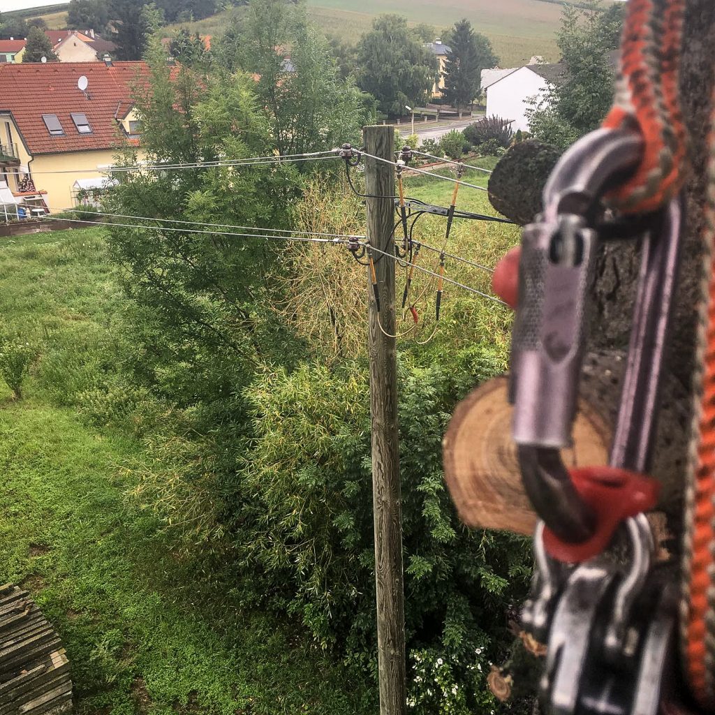 Es kommt immer wieder vor, dass der Kronenbereich von Bäumen in den Bereich von Telefon/Stromleitungen hineinwachsen. Hier wird oft ein „Freischneiden“ notwendig. Um sie Sicherheit des Kletterers zu gewährleisten, wird die Leitung „stromlos“ geschalten.